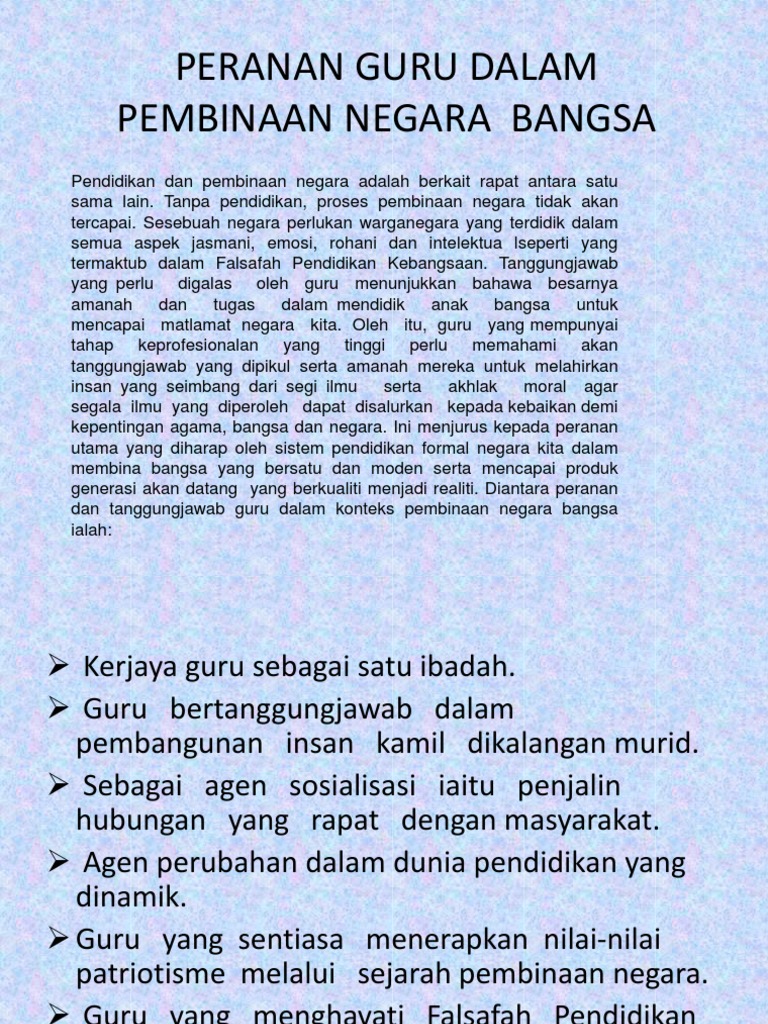 Personaliti guru sebagai pembina negara bangsa Berpandangan progresif dan saintifik Sentiasa menokok tambah ilmunya dengan membaca menghadiri seminar dan. Peranan Guru Sebagai Pembina Negara Bangsa HUBUNGI KAMI. Sebagai guru pembina bangsa negara maka guru harus berupaya.